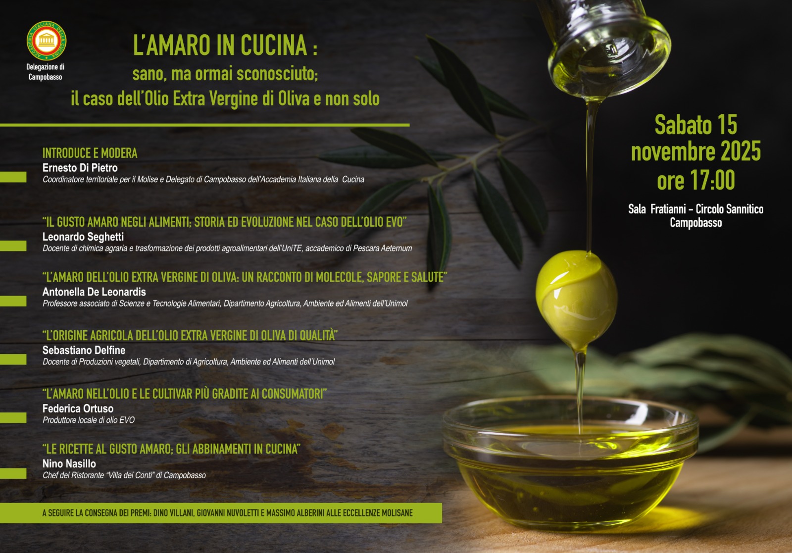 Il giorno sabato 15 novembre 2025 si terrà il convegno dal titolo “L’AMARO IN CUCINA: sano, ma ormai sconosciuto; il caso dell’Olio Extra Vergine di Oliva”, organizzato dalla Delegazione di Campobasso dell'Accademia Italiana della Cucina.