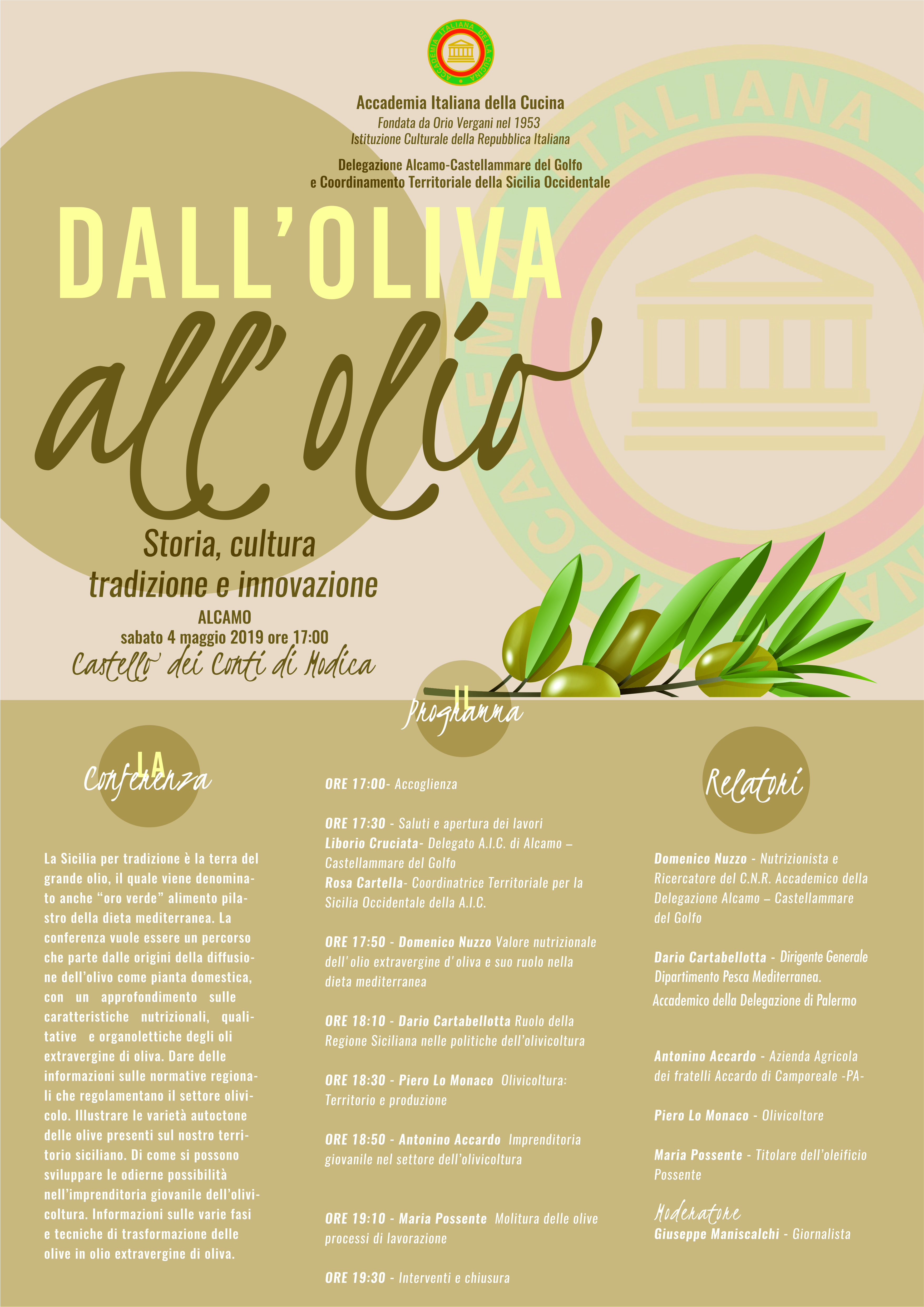 La Delegazione di Alcamo-Castellammare del Golfo organizza un convegno dal titolo "Dall'olivo all'olio" che si terrà il giorno sabato 4 maggio. Sabato 4 maggio Castello dei Conti di Modica Alcamo (TP) Periodo: Sabato, 4 Maggio, 2019Luogo: Alcamo (TP)Delegazione: ALCAMO - CASTELLAMMARE DEL GOLFOFile: Programma Conferenza.jpg
